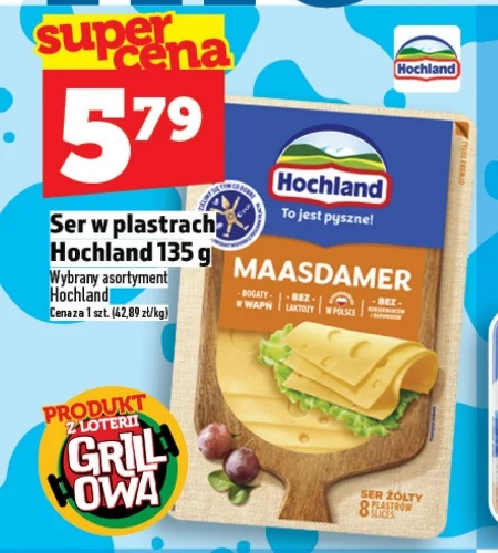 Ser w plastrach Hochland, dostępny w ofercie Topaz, kosztuje 5,79 zł za opakowanie 135 g, co daje cenę 42,89 zł za kilogram. Produkt ten to wygodne rozwiązanie do kanapek, przekąsek czy jako dodatek do dań. Wybrany asortyment Hochland charakteryzuje się delikatnym smakiem i łatwością w użyciu dzięki praktycznym plasterkom. To świetna okazja, by zaopatrzyć się w ulubiony ser w atrakcyjnej cenie. Oferta ważna od 2026-04-16 do 2026-04-22 Źródło: gazetka Topaz