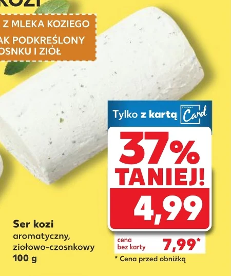 Ser kozi jest dostępny w ofercie Kaufland w cenie 4,99 zł za 100 g, co stanowi 37% taniej niż cena bez karty, wynosząca 7,99 zł. Ten aromatyczny ser kozi o ziołowo-czosnkowym smaku to idealny dodatek do kanapek, sałatek lub jako wykwintna przekąska. Doskonale sprawdzi się podczas spotkań z przyjaciółmi i rodzinnych pikników. Skorzystaj z wyjątkowej okazji i spróbuj tego pysznego sera w obniżonej cenie tylko z kartą Kaufland Card. Oferta ważna od 2026-04-09 do 2026-04-22 Źródło: gazetka Kaufland