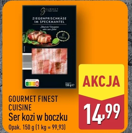 Gourmet Finest Cuisine Ser kozi w boczku jest dostępny w Aldi w cenie 14,99 za opakowanie 150 g (1 kg = 99,93). Delikatny ser kozi, owinięty w aromatyczny boczek, stanowi wyjątkową przekąskę lub dodatek do sałatek i kanapek. Ten produkt to propozycja dla miłośników wykwintnych smaków, którzy cenią sobie połączenie kremowej konsystencji sera z intensywnym aromatem wędzonego boczku. Warto skorzystać z tej okazji i spróbować wyjątkowego smaku sera koziego w boczku. Źródło: gazetka Aldi