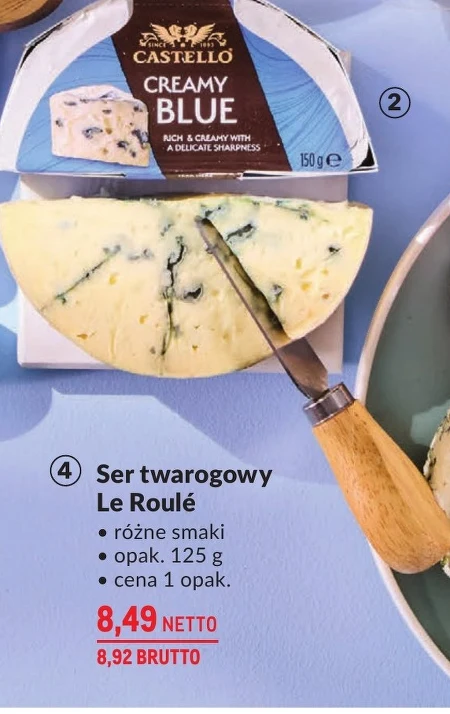Ser twarogowy Le Roulé • różne smaki • opak. 125 g • cena 1 opak. 8,49 NETTO 8,92 BRUTTO Ser twarogowy Le Roulé dostępny w opakowaniach po 125 g, w różnych smakach, to idealna przekąska lub składnik do dań. Sprawdź najkorzystniejszą ofertę w Makro Cash&Carry – cena jednego opakowania to 8,49 zł netto, 8,92 zł brutto. Można go spożywać samodzielnie, dodawać do kanapek lub wykorzystywać w deserach.