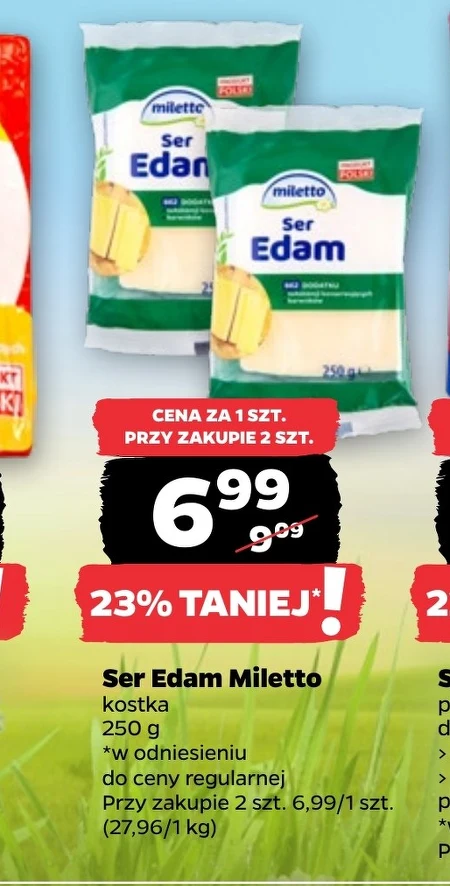 Ser Edam Miletto jest dostępny w ofercie Netto w cenie 6,99 zł za sztukę przy zakupie dwóch opakowań, normalnie kosztuje 9,99 zł, co stanowi 23% zniżki. Produkt jest sprzedawany w kostce o wadze 250 g, a cena za kilogram wynosi 27,96 zł. To półtwardy ser o łagodnym, lekko słodkawym smaku, idealny do kanapek, sałatek oraz jako dodatek do dań obiadowych. Warto skorzystać z tej okazji i zaopatrzyć się w ulubiony ser w atrakcyjnej cenie. Oferta ważna od 2026-04-13 do 2026-04-18 Źródło: gazetka Netto