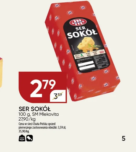 SER SOKÓŁ 100 g, SM Mlekovita 27,90/kg Cena w sieci Chata Polska sprzed pierwszego zastosowania obniżki: 3,59 zł, 35,90/kg.