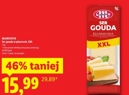 MLEKOVITA Ser gouda w plastrach, XXL 1 kg * cena przed obniżką/cena poza promocją: 29,89/opak. Limit: 3 opak. na paragon. Idealnie nadaje się do kanapek, tostów oraz sałatek, wzbogacając je o kremowy smak i aromat. Dzięki swojej uniwersalności, ser gouda w plastrach świetnie sprawdzi się również jako dodatek do zapiekanek czy pizzy, nadając im wyjątkowego charakteru.