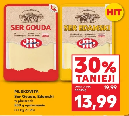 MLEKOVITA Ser Gouda, Edamski w plastrach dostępny jest teraz w Kaufland w cenie 13,99 zł za opakowanie o wadze 500 g, co daje 27,98 zł za kilogram. Promocja obejmuje obniżkę o 30% z ceny pierwotnej 19,99 zł. Ser w wygodnych plastrach idealnie nadaje się do szybkiego przygotowania kanapek, przekąsek lub jako dodatek do sałatek. Opakowanie zawiera ser Gouda i Edamski, co pozwala na różnorodność smaków. Nie przegap okazji, aby zaopatrzyć się w ten popularny ser w atrakcyjnej cenie.