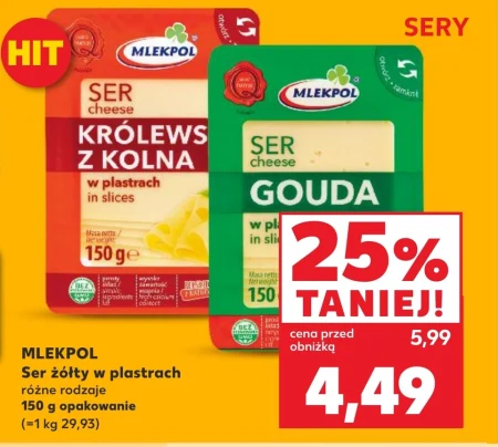 MLEKPOL Ser żółty w plastrach różne rodzaje 150 g opakowanie (=1 kg 29,93)