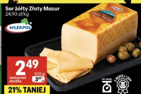 Ser żółty Złoty Mazur jest dostępny w Delikatesy Centrum w cenie 24,90 zł za kilogram, co oznacza 21% taniej niż cena regularna 3,19 zł. Aktualnie 100 gramów sera kosztuje 2,49 zł. Ten tradycyjny ser doskonale sprawdzi się zarówno na kanapki, jak i jako składnik dań na ciepło, czy samodzielna przekąska. Warto skorzystać z tej okazji, aby zaopatrzyć się w ulubiony ser w atrakcyjnej cenie. Oferta ważna od 2026-04-16 do 2026-04-22 Źródło: gazetka Delikatesy Centrum