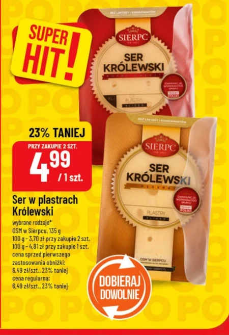 Ser w plastrach Królewski wybrane rodzaje* OSM w Sierpcu, 135 g 100 g – 3,70 zł przy zakupie 2 szt. 100 g – 4,81 zł przy zakupie 1 szt. cena sprzed pierwszego zastosowania obniżki: 6,49 zł/szt., 23% taniej cena regularna: 6,49 zł/szt., 23% taniej Ser w plastrach Królewski, dostępny w wybranych rodzajach, to szybki i wygodny sposób na urozmaicenie kanapek, sałatek czy przekąsek. W ofercie POLOmarket znajdziesz produkt OSM Sierpc w gramaturze 135g. Promocja obejmuje obniżkę ceny – kupując dwie sztuki zapłacisz mniej za 100g, a cena regularna została obniżona o 23%. Idealny dla każdego, kto ceni sobie smak i oszczędność.