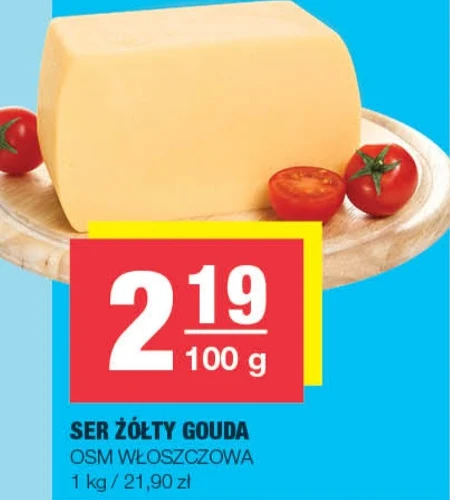 SER ŻÓŁTY GOUDA OSM WŁOSZCZOWA 1 kg / 21,90 zł Wyjątkowy ser żółty Gouda OSM Włoszczowa to doskonały składnik do kanapek, zapiekanek i sałatek, idealny dla miłośników **klasycznego smaku sera**. Ten wysokiej jakości **ser Gouda** o wadze 1 kg sprawdzi się również jako przekąska do wina lub dodatek do deski serów, dostarczając niezapomnianych wrażeń smakowych, a jego naturalny smak zadowoli nawet najbardziej wymagających. To uniwersalny **ser do krojenia** i **ser do smażenia**, który wzbogaci każde danie.