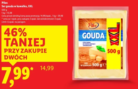Pilos Ser gouda w kawałku, XXL 500 g 1 kg = 15,98 Cena przed obniżką/cena poza promocją: 14,99/opak., 1 kg = 29,98 * cena za 1 opak. przy zakupie 2 opak. lub wielokrotności 2 opak. Limit: 6 opak. na paragon.