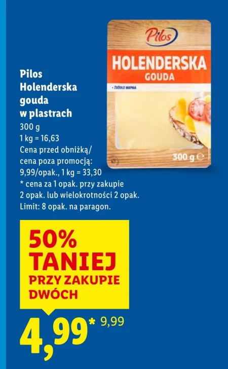 Pilos Holenderska gouda w plastrach 300 g 1 kg = 16,63 Cena przed obniżką/ cena poza promocją: 9,99/opak., 1 kg = 33,30 * cena za 1 opak. przy zakupie 2 opak. lub wielokrotności 2 opak. Limit: 8 opak. na paragon.