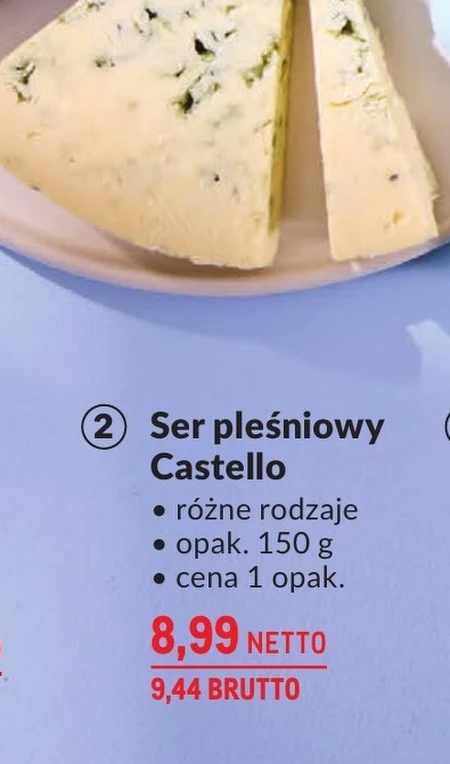 Ser pleśniowy Castello • różne rodzaje • opak. 150 g • cena 1 opak. 8,99 NETTO 9,44 BRUTTO Ser pleśniowy Castello dostępny w różnych wariantach smakowych znajdziesz w Makro Cash&Carry w cenie 8,99 netto za opakowanie 150 g. To idealny wybór dla osób poszukujących wysokiej jakości serów do przekąsek, kanapek lub jako dodatek do dań. W Makro możesz zaopatrzyć się w ten ser zarówno do użytku domowego, jak i dla Twojej działalności gastronomicznej.