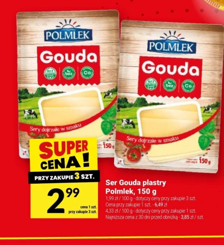 Ser Gouda w plastrach występuje w ofercie Twoj Market w cenie 1,99 zł za 100 g przy zakupie minimum trzech opakowań. Produkt jest idealny do kanapek, przekąsek lub jako dodatek do sałatek. Cena za pojedyncze opakowanie to 6,49 zł, co daje 4,33 zł za 100 g. Najniższa cena tego sera w ciągu ostatnich 30 dni wynosiła 3,85 zł za opakowanie, dlatego warto skorzystać z aktualnej promocji i zaopatrzyć się w ten popularny ser. Oferta ważna od 2026-04-15 do 2026-04-19 Źródło: gazetka Twoj Market