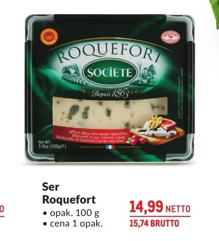 Ser Roquefort • opak. 100 g • cena 1 opak. 14,99 NETTO 15,74 BRUTTO Ser Roquefort dostępny w opakowaniach po 100g. Aktualnie w Makro Cash&Carry można go nabyć w cenie 14,99 zł netto, czyli 15,74 zł brutto. To pleśniowy ser owczy o intensywnym smaku, idealny do sałatek, sosów oraz jako dodatek do wina. Warto zaopatrzyć się w niego w Makro, aby mieć dostęp do wysokiej jakości produktów spożywczych w atrakcyjnych cenach.