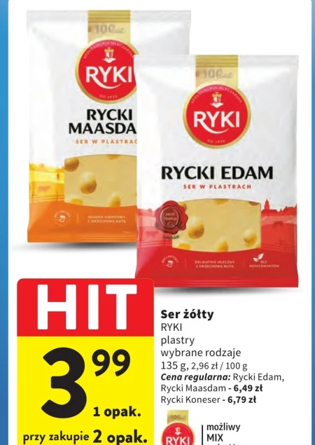 Ser żółty RYKI plastry wybrane rodzaje 135 g, 2,96 zł / 100 g Cena regularna: Rycki Edam, Rycki Maasdam - 6,49 zł Rycki Koneser - 6,79 zł