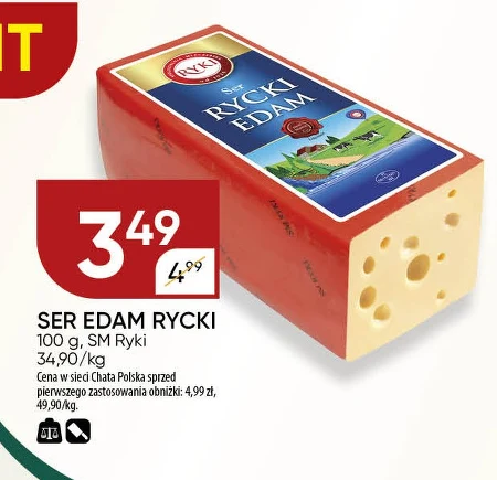 SER EDAM RYCKI 100 g, SM Ryki 34,90/kg Cena w sieci Chata Polska sprzed pierwszego zastosowania obniżki: 4,99 zł, 49,90/kg.