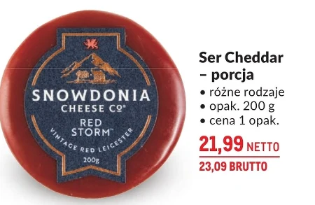 Ser Cheddar – porcja • różne rodzaje • opak. 200 g • cena 1 opak. 21,99 NETTO 23,09 BRUTTO Ser Cheddar dostępny w Makro Cash&Carry w opakowaniach po 200 g, w różnych odmianach. Cena jednego opakowania to 21,99 zł netto, czyli 23,09 zł brutto. Idealny do kanapek, zapiekanek, sałatek oraz jako dodatek do dań głównych, szczególnie atrakcyjny przy zakupach hurtowych w Makro. Sprawdź dostępne rodzaje i zaopatrz się w ulubiony ser cheddar.
