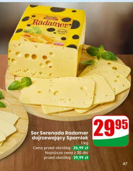 Ser Serenada Radamer jest dostępny w ofercie Dino w cenie 29,95 zł za kilogram, co stanowi obniżkę z 36,99 zł. To dojrzały ser Spomlek, idealny do kanapek, przekąsek lub jako dodatek do dań. Charakteryzuje się delikatnym smakiem i sprawdzi się zarówno na co dzień, jak i podczas specjalnych okazji. Warto skorzystać z tej okazji, ponieważ aktualna cena jest najniższa z ostatnich 30 dni, nawet biorąc pod uwagę poprzednią obniżkę.