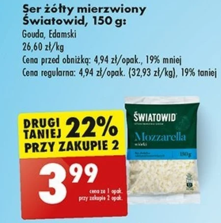 Ser żółty mierzwiony Światowid, 150 g: Gouda, Edamski 26,60 zł/kg Cena przed obniżką: 4,94 zł/opak., 19% mniej Cena regularna: 4,94 zł/opak. (32,93 zł/kg), 19% taniej