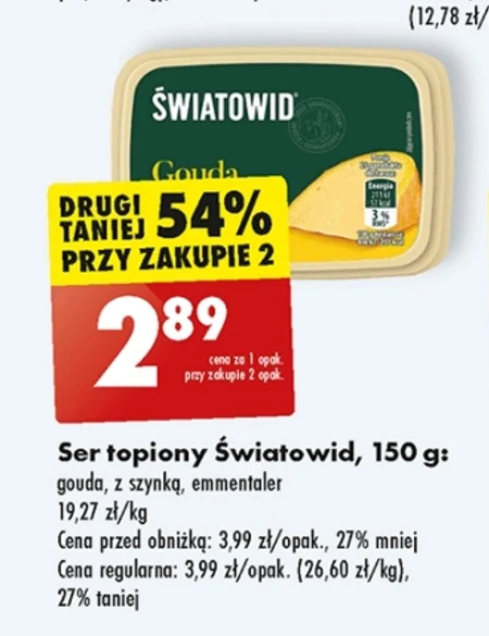 Ser topiony Światowid, 150 g: gouda, z szynką, emmentaler 19,27 zł/kg Cena przed obniżką: 3,99 zł/opak., 27% mniej Cena regularna: 3,99 zł/opak. (26,60 zł/kg), 27% taniej