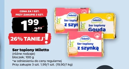 Ser topiony Miletto to kremowy ser w bloczku 100 g, dostępny w różnych rodzajach – m.in. z szynką i Gouda (19,90 zł/kg). W promocji przy zakupie 3 sztuk cena wynosi zaledwie 1,99 zł/szt. zamiast 2,69 zł – oszczędzasz aż 26%. Doskonały do kanapek, zapiekanek, tostów oraz jako pyszny topiony dodatek do dań gorących.