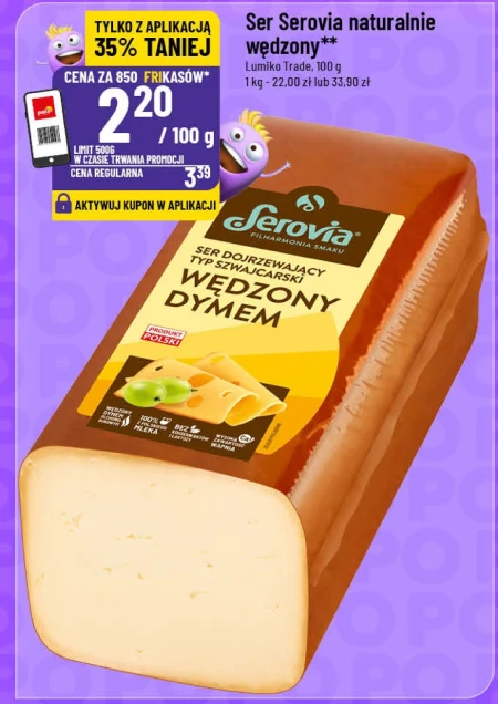 Ser Serovia naturalnie wędzony w cenie 22,00 zł za kilogram lub 33,90 zł za opakowanie 100 g to wyjątkowa oferta z gazetki promocyjnej POLOmarket, dostępna z 35% rabatem wyłącznie dla użytkowników aplikacji. Ten aromatyczny, wędzony ser idealnie sprawdzi się jako dodatek do kanapek, przekąska podczas spotkań z przyjaciółmi, czy też element deski serów. Aktywuj kupon w aplikacji i skorzystaj z tej okazji, aby spróbować wyśmienitego smaku wędzonki, pamiętając o limicie 500g w czasie trwania promocji.