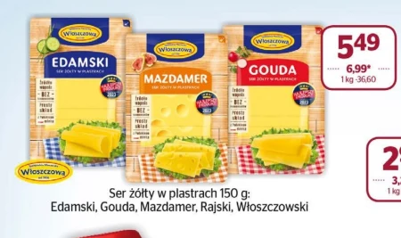 Ser żółty w plastrach 150 g: Edamski, Gouda, Mazdamer, Rajski, Włoszczowski