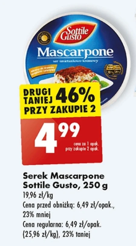 Serek Mascarpone Sottile Gusto, 250 g 19,96 zł/kg Cena przed obniżką: 6,49 zł/opak., 23% mniej Cena regularna: 6,49 zł/opak. (25,96 zł/kg), 23% taniej