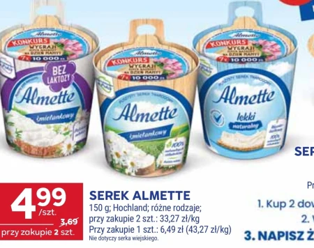 Serek Almette, występujący w ofercie Stokrotka, można kupić w cenie 4,99 zł za sztukę. Przy zakupie dwóch sztuk cena spada do 3,69 zł za opakowanie, co daje 33,27 zł za kilogram. Serek dostępny jest w różnych rodzajach i idealnie sprawdzi się jako dodatek do pieczywa, składnik sałatek lub przekąska. Produkt ten nie jest serkiem wiejskim i ma gramaturę 150 g. Warto skorzystać z tej okazji, aby zaopatrzyć się w ulubiony serek w korzystnej cenie.
