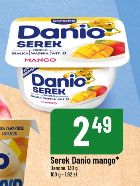 Serek Danio mango* Danone, 130 g 100 g - 1,92 zł Serek Danio o smaku mango to idealna przekąska dla każdego, kto lubi orzeźwiające połączenie smaków. Produkt firmy Danone, dostępny w opakowaniu 130g, doskonale sprawdzi się jako szybkie śniadanie, deser, a nawet element zdrowszej przekąski w ciągu dnia. Można go kupić w sieci sklepów POLOmarket w cenie 100g - 1,92 zł.