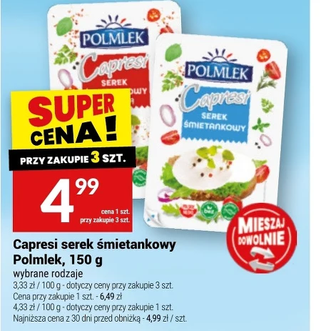 Capresi serek śmietankowy Polmlek, 150 g wybrane rodzaje 3,33 zł / 100 g - dotyczy ceny przy zakupie 3 szt. Cena przy zakupie 1 szt. - 6,49 zł 4,33 zł / 100 g - dotyczy ceny przy zakupie 1 szt. Najniższa cena z 30 dni przed obniżką - 4,99 zł / szt.