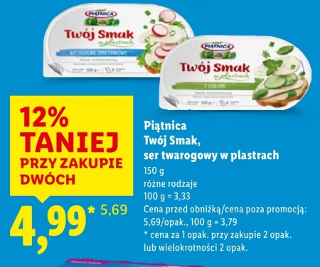 Piątnica Twój Smak, ser twarogowy w plastrach 150 g różne rodzaje 100 g = 3,33 Cena przed obniżką/cena poza promocją: 5,69/opak., 100 g = 3,79 * cena za 1 opak. przy zakupie 2 opak. lub wielokrotności 2 opak.