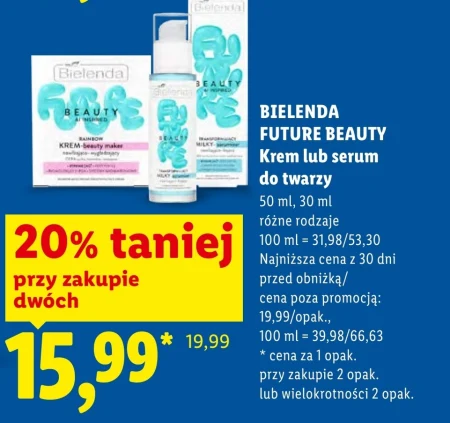 Krem lub serum do twarzy Bielenda Future Beauty dostępne jest w ofercie Lidl w cenie 15,99 zł za opakowanie przy zakupie dwóch lub więcej sztuk, normalnie kosztuje 19,99 zł. Dostępne są opakowania o pojemności 30 ml i 50 ml, w różnych wariantach. Produkt przeznaczony jest do pielęgnacji twarzy, zapewniając odpowiednie nawilżenie i odżywienie skóry. To okazja, żeby zadbać o codzienną rutynę kosmetyczną w korzystnej cenie. Oferta ważna od 2026-04-13 do 2026-04-15 Źródło: gazetka Lidl
