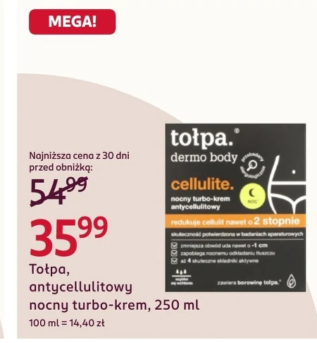 Tołpa, antycellulitowy nocny turbo-krem, 250 ml 35,99 100 ml = 14,40 zł Tołpa antycellulitowy nocny turbo-krem to intensywna kuracja na redukcję cellulitu, szczególnie polecana do stosowania podczas snu. Znajdziesz go w ofercie Rossmanna w cenie 35,99 zł za 250 ml. Krem wzmacnia i uelastycznia skórę, poprawiając jej wygląd i redukując nierówności. Regularne stosowanie może przynieść widoczne efekty w walce z cellulitem.