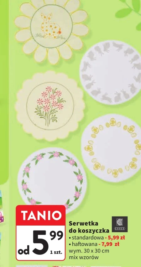 Serwetka do koszyczka występuje w ofercie Intermarche w cenie od 5,99 zł. Dostępne są zarówno wersje standardowe, jak i haftowane, które kosztują 7,99 zł. Serwetki mają wymiary 30 x 30 cm i występują w różnorodnych wzorach, dzięki czemu z łatwością dobierzesz odpowiedni model do swojego wystroju. Ten praktyczny dodatek do domu doskonale sprawdzi się podczas codziennych posiłków, uroczystych obiadów czy spotkań z rodziną i przyjaciółmi. Estetyczny wygląd serwetki wprowadzi przyjemną atmosferę, a jej miękka faktura zapewni komfort użytkowania. Warto skorzystać z tej okazji i zaopatrzyć się w serwetki do koszyczka, które staną się ozdobą każdego stołu. Różnorodność dostępnych wzorów pozwoli na stworzenie unikalnej aranżacji.