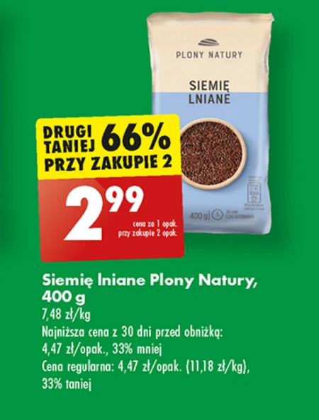 Siemię lniane Plony Natury, 400 g 7,48 zł/kg Najniższa cena z 30 dni przed obniżką: 4,47 zł/opak., 33% mniej Cena regularna: 4,47 zł/opak. (11,18 zł/kg), 33% taniej