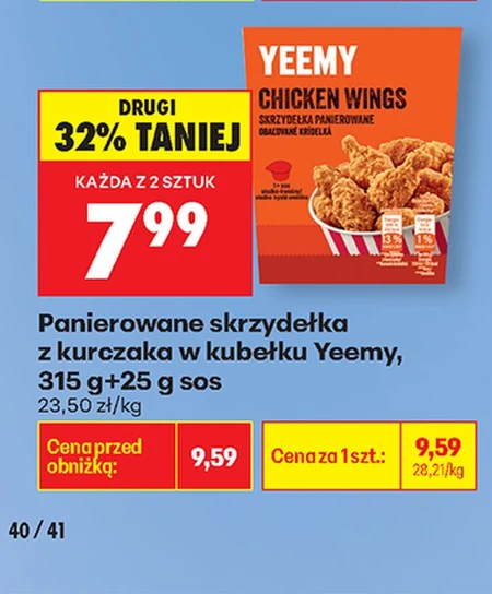 Panierowane skrzydełka z kurczaka w kubełku Yeemy, 315 g+25 g sos 23,50 zł/kg