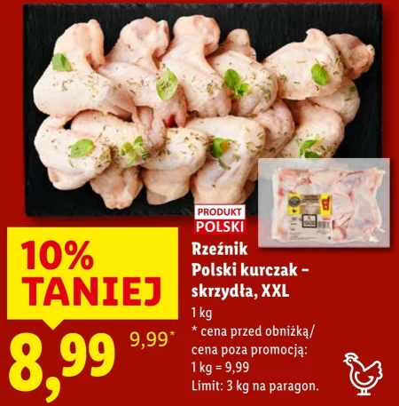 Rzeźnik Polski kurczak - skrzydła, XXL 1 kg * cena przed obniżką/ cena poza promocją: 1 kg = 9,99 Limit: 3 kg na paragon.