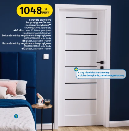 Skrzydło drzwiowe bezprzylgowe Toreno z czarnymi szybkami ** 5900378217992, kolor biały 448 zł/szt., szer. 70, 80 cm. pokojowe, z podcięciem wentylacyjnym Belka ościeżnicy regulowana bezprzylgowa 5900378203513, kolor biały 188 zł/szt., zakres 80-175 mm Baza ościeżnicy regulowana bezprzylgowa 5900378203582, kolor biały 412 zł/szt., zakres 80-175 mm