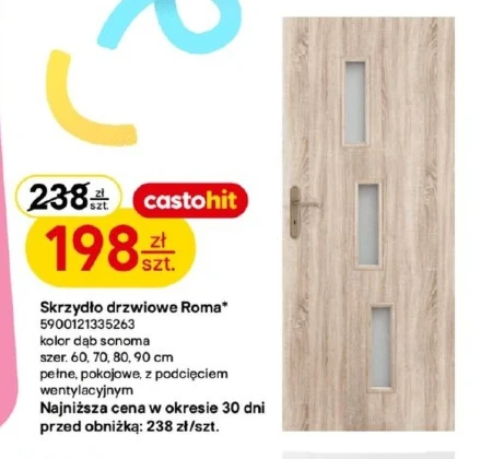 Skrzydło drzwiowe Roma występuje w ofercie Castorama w cenie 198 zł za sztukę, obniżonej z 238 zł. Dostępne w szerokościach 60, 70, 80 i 90 cm, to pełne, pokojowe skrzydło z podcięciem wentylacyjnym, wykończone w kolorze dąb sonoma. Idealnie sprawdzi się jako element wyposażenia wnętrz, zapewniając funkcjonalność i estetyczny wygląd. Sprawdź aktualną promocję i wyposaż swoje wnętrza w atrakcyjnej cenie. Oferta ważna od 2026-04-07 do 2026-04-21 Źródło: gazetka Castorama