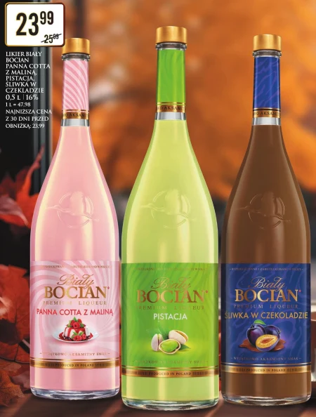 Likier Biały Bocian, panna cotta, z malina, pistacja, śliwka w czekoladzie, 0,5 L, 1L = 47,98 zł