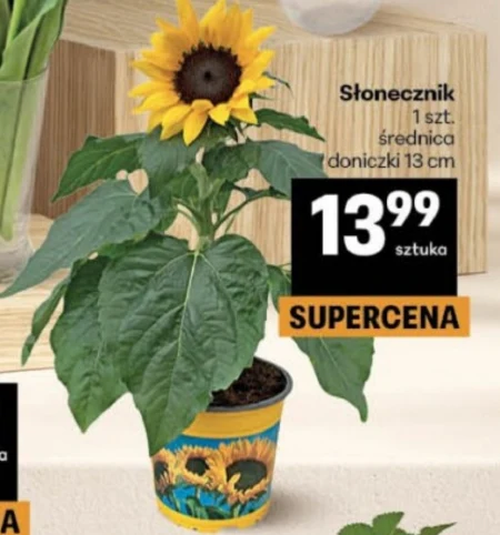Słonecznik jest dostępny w Delikatesy Centrum w cenie 13,99 za sztukę. Roślina w doniczce o średnicy trzynastu centymetrów idealnie sprawdzi się jako element dekoracyjny w domu lub na balkonie. Wymaga podstawowej pielęgnacji i zapewni odrobinę natury w Twoim otoczeniu. To świetna okazja, aby wzbogacić wnętrze bez dużych nakładów. Oferta ważna od 2026-04-16 do 2026-04-22 Źródło: gazetka Delikatesy Centrum