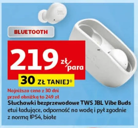 Słuchawki bezprzewodowe TWS JBL Vibe Buds etui ładujące, odporność na wodę i pył zgodnie z normą IP54, białe