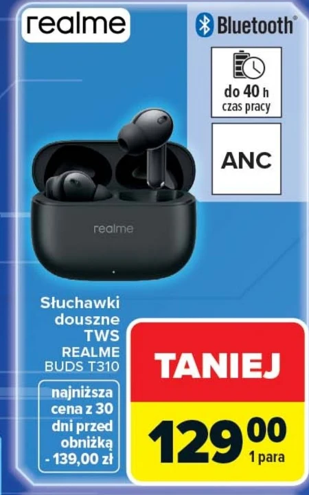 Słuchawki douszne TWS REALME BUDS T310 kupisz w Carrefour w cenie 129,00 zł za parę, co stanowi obniżkę względem najniższej ceny z ostatnich 30 dni, wynoszącej 139,00 zł. To bezprzewodowe słuchawki, idealne do słuchania muzyki, podcastów czy rozmów telefonicznych w ruchu. Oferują wygodę użytkowania i eliminują splątane kable, a technologia TWS zapewnia stabilne połączenie z urządzeniem. To doskonała okazja, aby za rozsądne pieniądze cieszyć się wysoką jakością dźwięku i komfortem użytkowania podczas codziennych aktywności. Oferta ważna od 2026-04-13 do 2026-05-02 Źródło: gazetka Carrefour