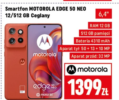Smartfon MOTOROLA EDGE 50 NEO 12/512 GB Ceglany 6,4" RAM 12 GB 512 GB pamięci Bateria 4310 mAh Aparat tył 50 + 13 + 10 MP Aparat przód: 32 MP