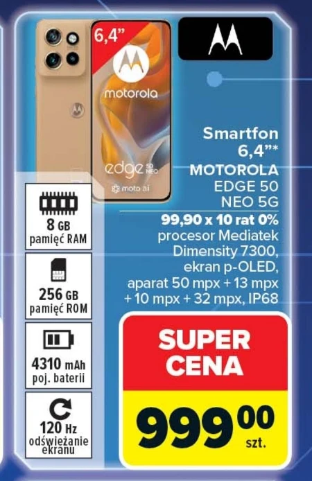 Smartfon 6,4" występuje w ofercie Carrefour w cenie 999,00 zł i można go nabyć w 99,90 x 10 ratach 0%. Wyposażony został w wydajny procesor Mediatek Dimensity 7300, oferując płynne działanie aplikacji i gier. Posiada ekran p-OLED, wysoką rozdzielczość oraz system aparatów składający się z obiektywów 50 mpx, 13 mpx, 10 mpx i 32 mpx, zapewniając doskonałą jakość zdjęć i filmów. Ten model smartfona charakteryzuje się 8 GB pamięci RAM oraz 256 GB pamięci ROM, co pozwala na przechowywanie dużej ilości danych i komfortowe korzystanie z wielu aplikacji jednocześnie. Dodatkowo, bateria o pojemności 4310 mAh i częstotliwość odświeżania ekranu na poziomie 120 Hz gwarantują długotrwałe użytkowanie i płynność obrazu. Smartfon jest odporny na pył i wodę dzięki certyfikatowi IP68. To wyjątkowa okazja, aby zaopatrzyć się w nowoczesny i funkcjonalny smartfon w atrakcyjnej cenie. Oferta ważna od 2026-04-13 do 2026-05-02 Źródło: gazetka Carrefour