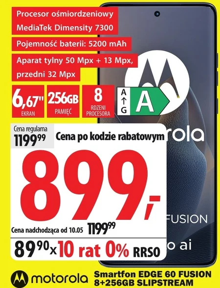 Smartfon EDGE 60 FUSION 8+256GB SLIPSTREAM kupisz w ofercie Media Expert w cenie 899,99 zł, po obniżce z 1199,99 zł. Ten wydajny telefon został wyposażony w ośmiordzeniowy procesor MediaTek Dimensity 7300, co zapewnia płynne działanie nawet wymagających aplikacji i gier. Posiada także dużą pamięć wewnętrzną oraz pojemną baterię o mocy 5200 mAh, gwarantując długi czas pracy i komfort użytkowania. Ten model oferuje wysoką jakość zdjęć dzięki potrójnemu aparatowi z matrycą 50 Mpx oraz przedniemu aparatowi 32 Mpx, idealne do dokumentowania ważnych chwil. Wyświetlacz o przekątnej 6,67 cala zapewnia komfort oglądania multimediów. Oferta jest ograniczona czasowo – cena 899,99 zł obowiązuje do 10 maja, po czym produkt wróci do ceny regularnej. Możliwość zakupu na 10 rat 0% RRSO czyni to doskonałą okazją, by zdobyć nowoczesny smartfon w atrakcyjnej cenie. Źródło: gazetka Media Expert