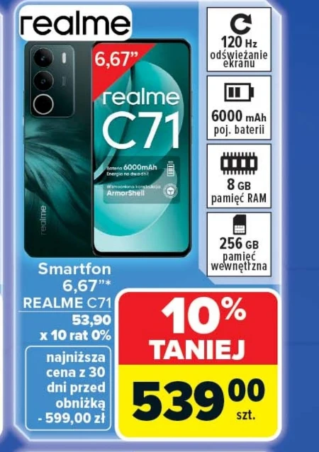 Smartfon realme C71 jest dostępny w Carrefour w cenie 539,00 zł za sztukę, co oznacza 10% taniej w porównaniu do ceny 599,00 zł z ostatnich 30 dni. Możliwość zakupu na 10 rat 0% sprawia, że to atrakcyjna oferta. Ten smartfon z ekranem o przekątnej 6,67” i częstotliwości odświeżania 120 Hz, posiada baterię o pojemności 6000 mAh, 8 GB pamięci RAM oraz 256 GB pamięci wewnętrznej, co zapewnia płynne działanie i komfort korzystania z ulubionych aplikacji. Dodatkowo, technologia ArmorShell zwiększa odporność urządzenia. To doskonały wybór dla osób szukających wydajnego i niezawodnego smartfona w przystępnej cenie. Oferta ważna od 2026-04-13 do 2026-05-02 Źródło: gazetka Carrefour