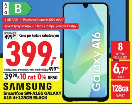 SAMSUNG Smartfon SM-A165 GALAXY A16 4+128GB BLACK 4 GB RAM Pojemność baterii: 5000 mAh Aparat tylny 50 Mpx + 5 Mpx + 2 Mpx, przedni 13 Mpx