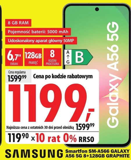 Smartfon SM-A566 GALAXY A56 5G 8+128GB GRAPHITE 8 GB RAM Pojemność baterii: 5000 mAh Udoskonalony aparat główny 50MP