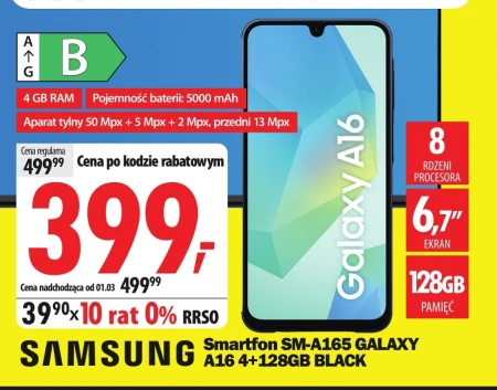 Smartfon SM-A165 GALAXY A16 4+128GB BLACK 4 GB RAM Pojemność baterii: 5000 mAh Aparat tylny 50 Mpx + 5 Mpx + 2 Mpx, przedni 13 Mpx